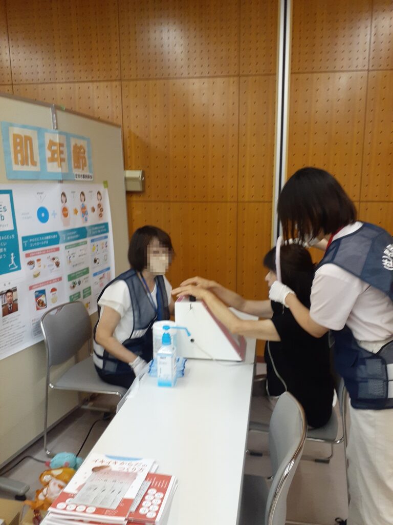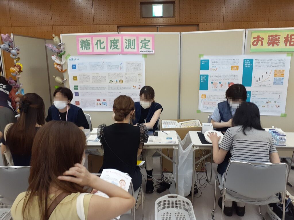 薬剤師会のブースでは、糖化度測定、肌年齢測定、お子様対象の分包体験コーナーを設けました。測定結果を基に薬や生活についてお話もさせていただきました。