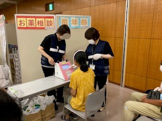 薬剤師会のブースでは、糖化度測定、肌年齢測定、お子様対象の分包体験コーナーを設けました。