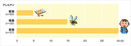 アナフィラキシーの特徴のひとつは、短時間で症状があらわれること。症状が出るまでの時間は、アレルゲンや患者さんによって差があります。