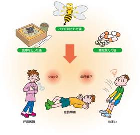 アナフィラキシーとは、重篤で生命に危険を及ぼす全身性のアレルギー反応で、皮膚粘膜、呼吸器、循環器、消化管など様々な臓器で様々な症状を起こします。アナフィラキシーが重篤な状態の場合は、血圧が低下し、意識の状態も低下を認めたりするアナフィラキシーショックと呼ばれる生命に関わる状態に陥ることもあります。