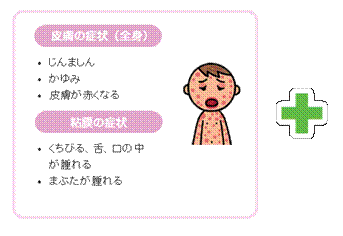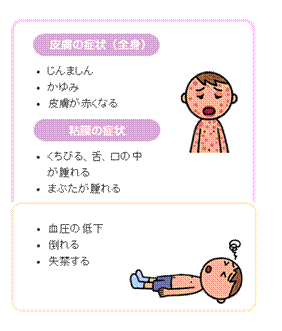 ① 突然(数分~数時間)、皮膚や粘膜の症状があらわれ、さらに呼吸器系の症状あるいは血圧の