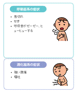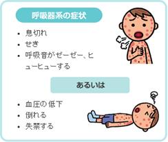 ショック症状(ぐったり、意識障害、失禁など)やのどの強い症状(のどが締め付けられる感じ、声がれ、声が出ないなど)、呼吸器系の強い症状(強い喘鳴、呼吸困難など)があらわれた場合には、速やかにアドレナリン自己注射薬(アナフィラキシー補助治療剤:医師の処方箋が必要)を用います。