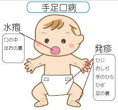 手足口病は口の中や手のひら、足の裏などに小さな水ふくれや湿疹ができる病気です。(右図)