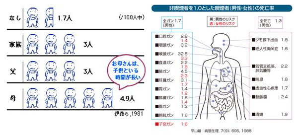 右図:家庭内喫煙者と幼児(3歳児)の有喘息様気管支炎率